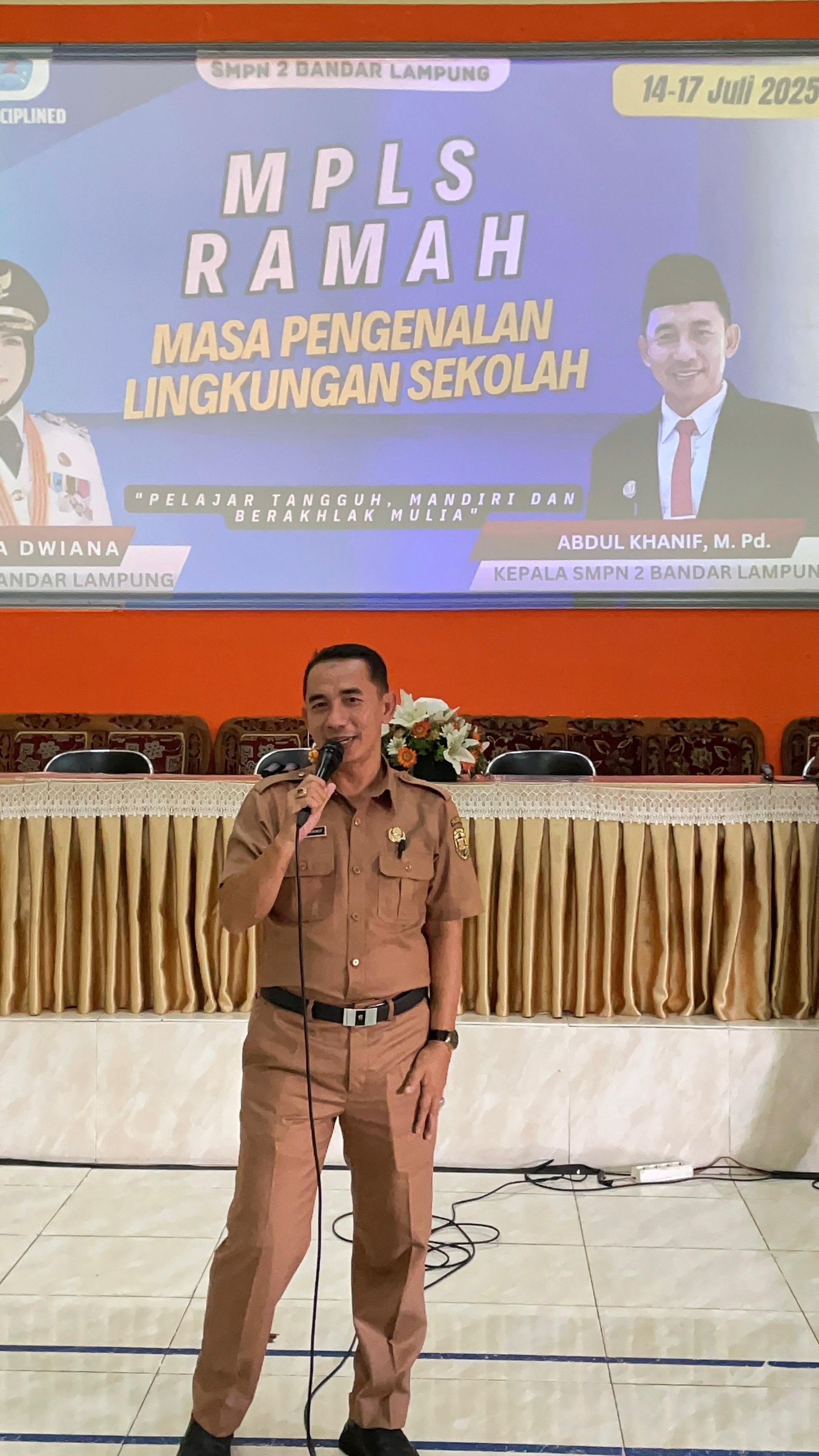 Yang sangat dinanti oleh siswa adalah saat Bapak Kepala SMPN 2 Bandar Lampung, Abdul Khanif, M.Pd., hadir langsung dan menyampaikan materi di aula. Dalam pemaparannya, beliau menyambut hangat seluruh siswa baru dan memberikan motivasi yang membakar semangat belajar. Beliau menekankan pentingnya disiplin, sopan santun, dan semangat kolaborasi dalam membentuk pribadi yang unggul di era global, selaras dengan visi sekolah.