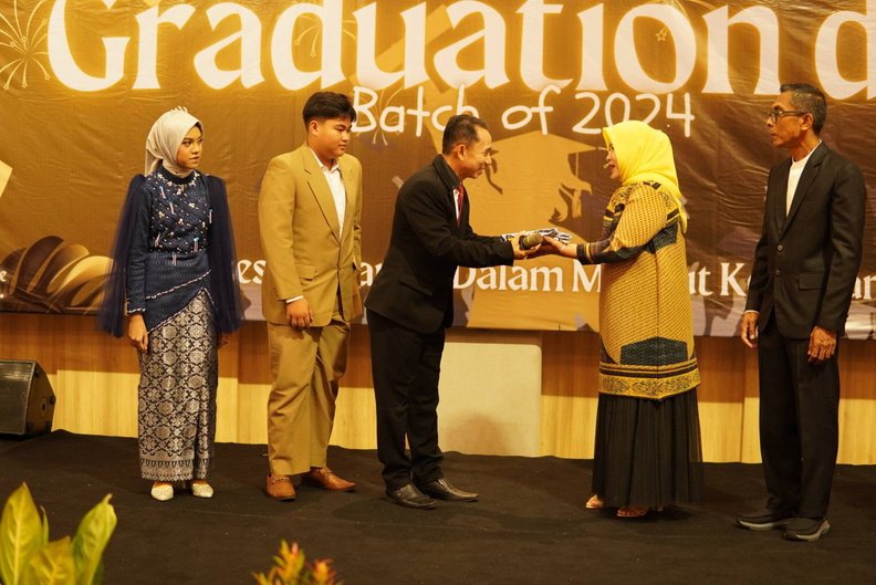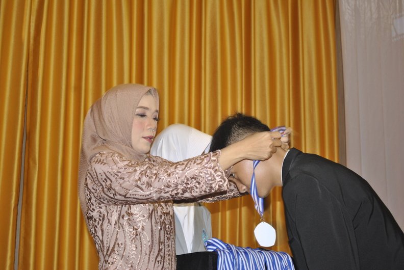 Puncak acara ditandai dengan prosesi pengalungan medali kelulusan oleh kepala sekolah, diiringi oleh lagu-lagu yang menyentuh hati. Para siswa satu per satu maju ke panggung dengan wajah penuh kebanggaan dan haru, menerima medali sebagai simbol kelulusan mereka.