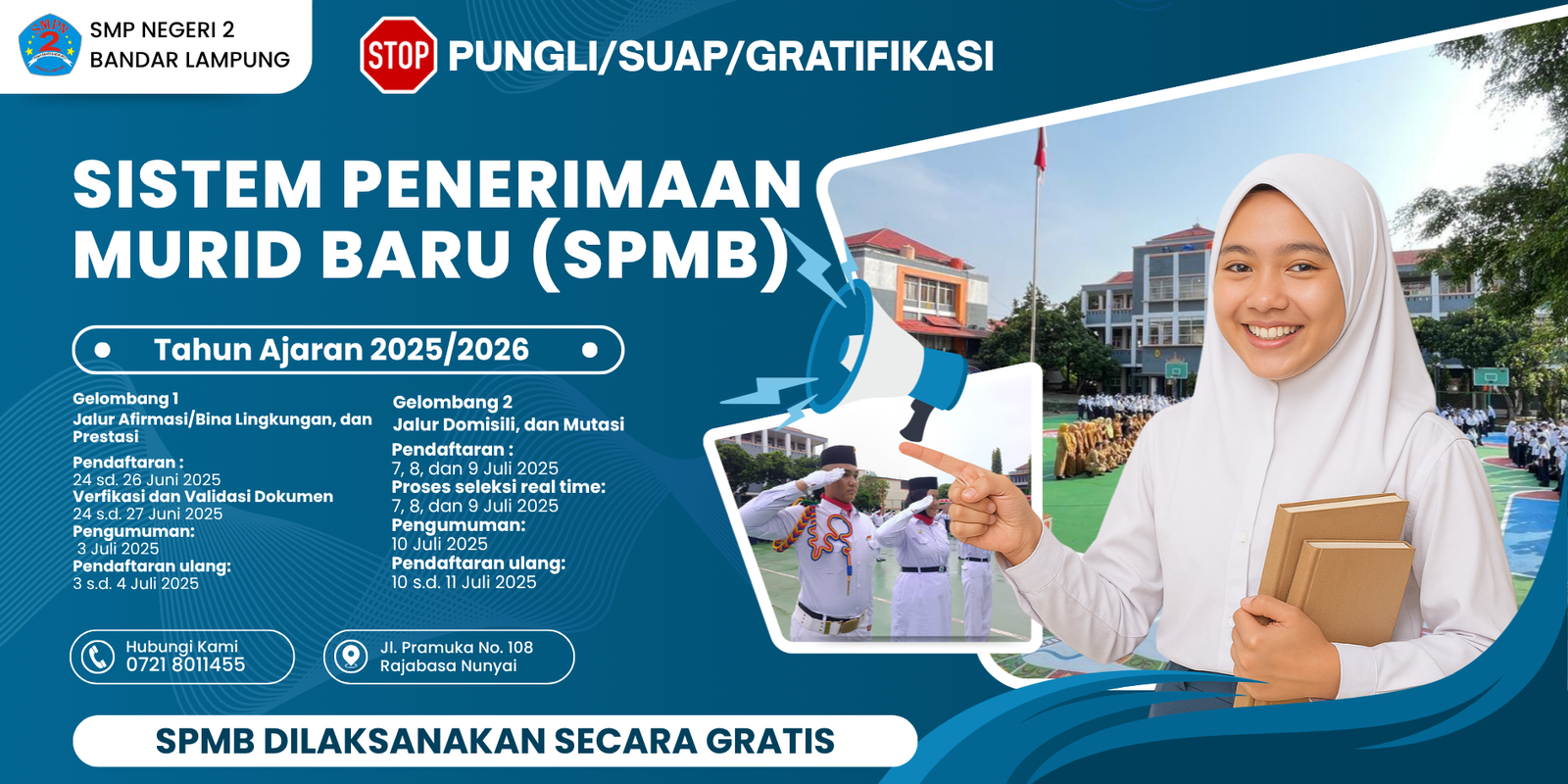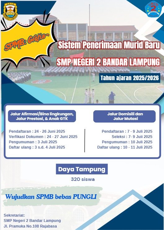 Berikut kami sampaikan Sistem Penerimaan Murid Baru SMP Negeri 2 Bandar Lampung Tahun Pelajaran 2025/2026.