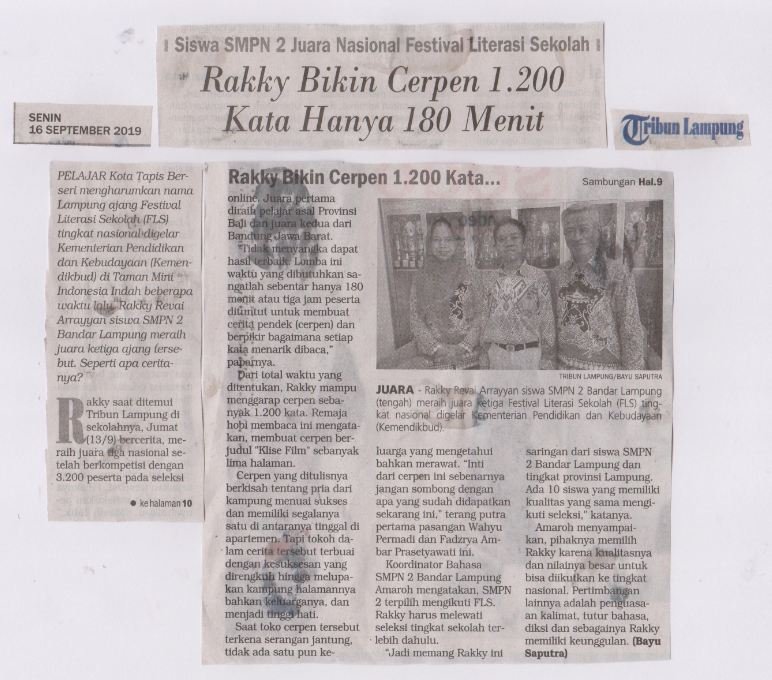 Siswa UPT SMPN 2 Bandar Lampung mengharumkan nama Lampung dalam ajang Festival Literasi Sekolah (FLS) tingkat nasional yang digelar oleh Kementerian Pendidikan dan Kebudayaan di Taman Mini Indonesia Indah beberapa waktu lalu.